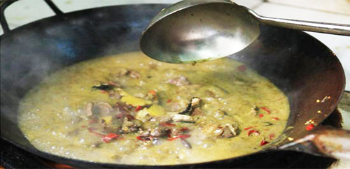 火锅底料在未煮之前,闻着有股淡淡的腐草味,随后将牛肉牛杂倒入火锅中,就像重庆人吃汤锅一样,但是在煮的时分有一点牛粪味。吃起有一股药味还有一点苦。尽管能够自己调制蘸碟,但还是压不住那个味,汤底里加入了石菖蒲和藿香川芎等香料,会越吃越香。在宰杀前用上等的青草加中草药材喂饱牛,宰杀后把牛胃及小肠里未完全消化的食物拿出来,挤出其间液体,加入牛胆汁及佐料放入锅内文火慢熬后食用。